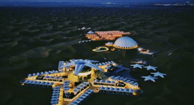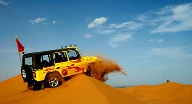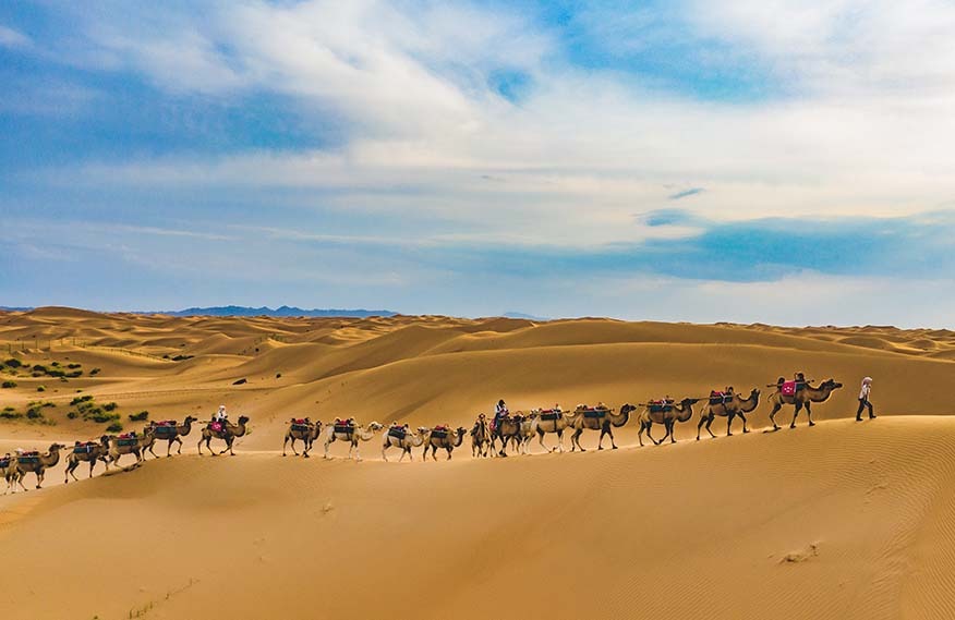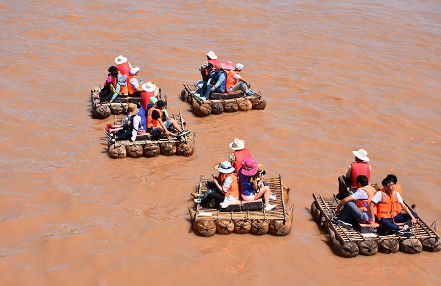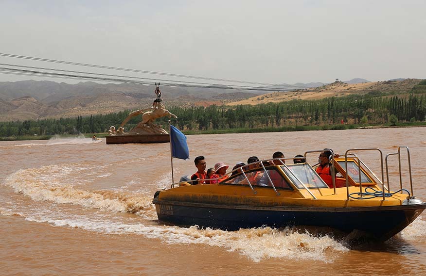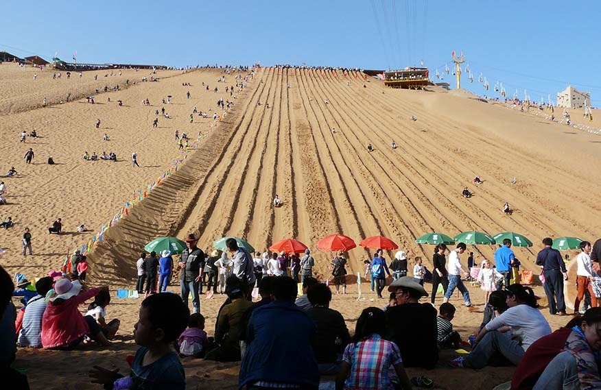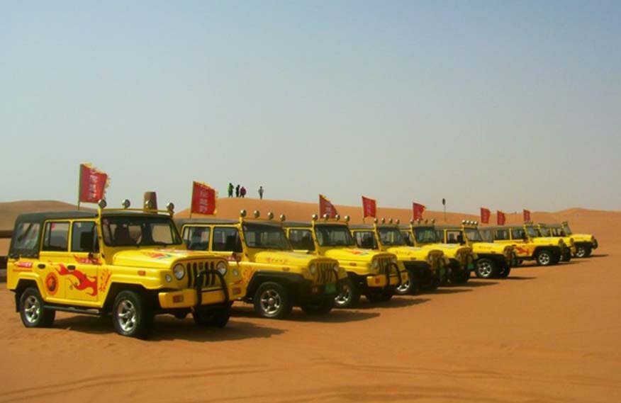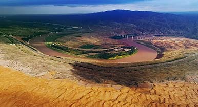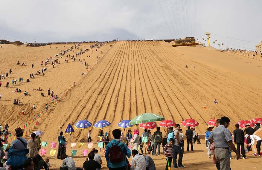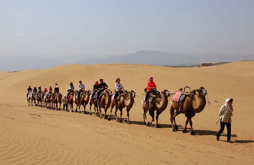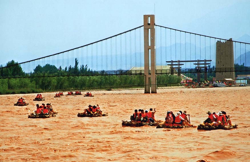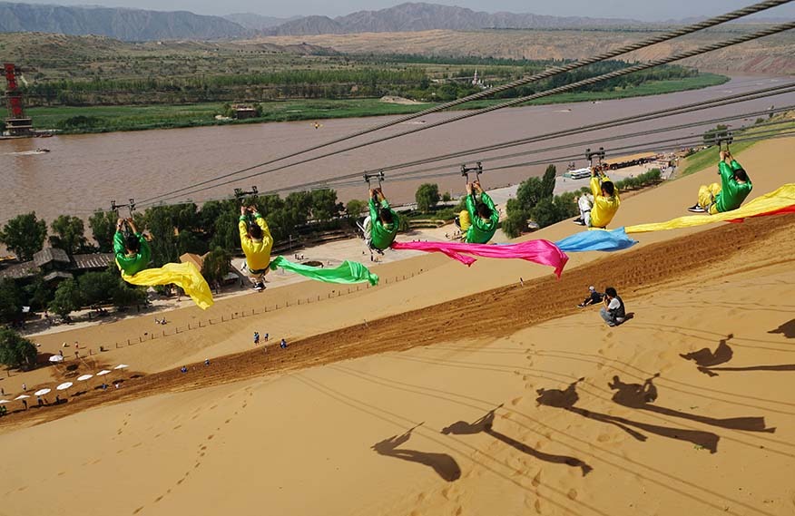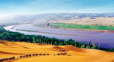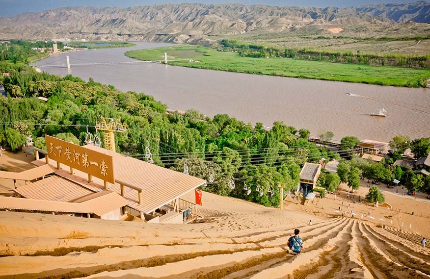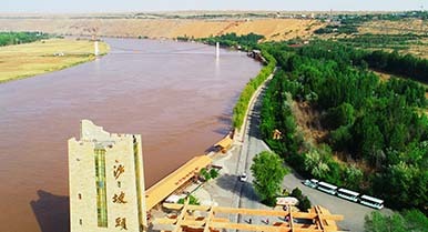It is a one-stop scenic area for sightseeing, vacation, and leisure. You can enjoy the brightest star in the desert—Desert Star Hotel, the largest natural sand slide in China—"Toll on Sand Slope", the "first cableway over the Yellow River" of 820 meters long, and the oldest transport means on the Yellow River—sheepskin raft here. In addition to the tourism facilities above, you can also ride a camel to ramble in the sand sea, or take a surf car in the sand sea to appreciate the artistic view in Wang Wei's poetry: "Dust column rises vertically on the vast desert against a round sun setting in the Yellow River".