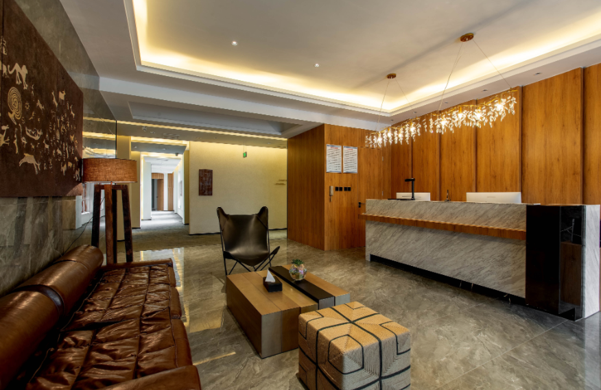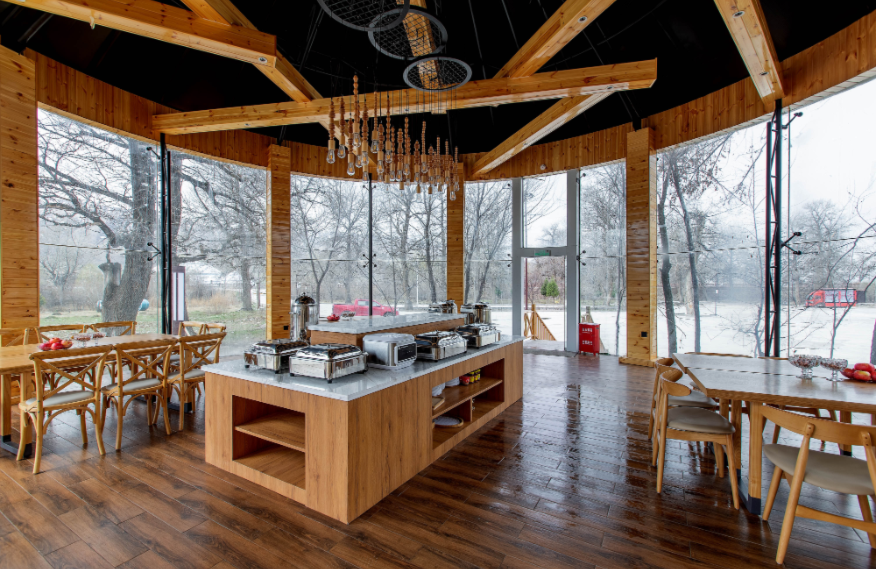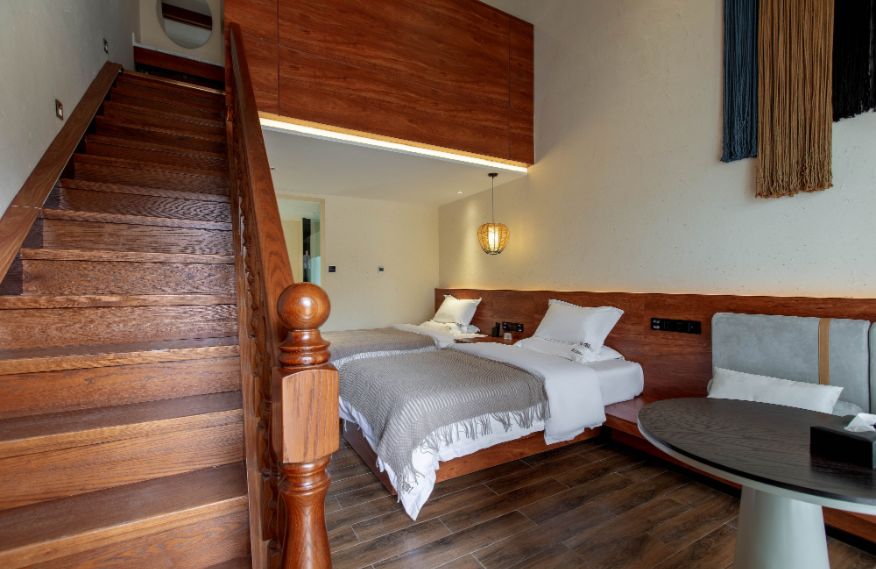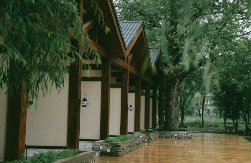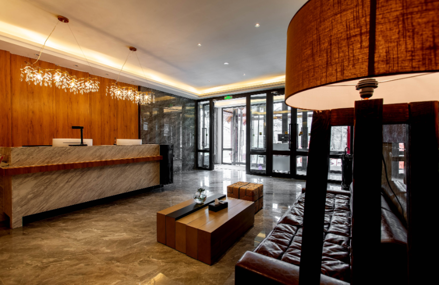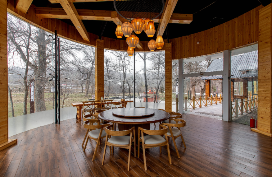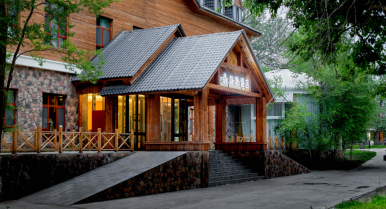 Linyin (it means “hidden in the forest” in Chinese) hotel is located in the forest, covering an area of 80mu (around 53,333 square meters). It is built with wood, stones, and glass, attempting to build a sightseeing place in the natural landscape. There are 55 guest rooms in the hotel (first phase), including 32 standard rooms, 10 queen-size rooms, 2 family suites, and 11 courtyard suites, supported by an restaurant covering 300m2. The guest rooms feature large space with scenic view, equipped with high-grade exquisite furniture and sanitary wares in compliance with quasi-five-star standards of ecological garden hotel. The decoration emphasizes the uniform and individualized style for comfort, warmth and practicality.