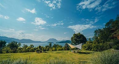 瀘沽湖面積50多平方千米,海拔2690米,湖水清澈蔚藍(lán),被譽(yù)為高原明珠。湖中有五個(gè)全島、三個(gè)半島和一個(gè)海堤連島,形態(tài)各異,翠綠如玉。湖的西北面,是摩梭人的格姆女神山;湖的東南面,與草海連接,淺海處茂密的蘆葦隨風(fēng)蕩漾,蔟蔟的花草迎風(fēng)招展;湖周,茂密的原始森林里珍稀動(dòng)物出沒其間,給人幾分畏懼,幾分野趣;湖畔,阡陌縱橫,田園萬頃,人們?nèi)粘龆?,日落而息,木摞房舍,炊煙裊裊,村寨牧歌陳陳,漁火點(diǎn)點(diǎn)。一派景象萬千的農(nóng)家農(nóng)園,令人流連忘返。
